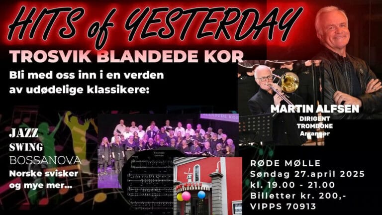 Søndag 27. april inviterer Trosvik Blandede Kor til en forrykende konsert med udødelige klassikere på Røde Mølle i Fredrikstad. Konsertprogrammet tilbyr en blanding av flere musikksjangere, som jazz, bossanova, norske svisker og mye mer. Vi har kalt konserten Hits of Yesterday og du vil oppleve et bredt spekter med over 17 sanger, så dette vil være noe for alle og enhver. Som vanlig dirigeres koret av Martin Alfsen og denne gangen bidrar han også med trombone! Velkommen!
