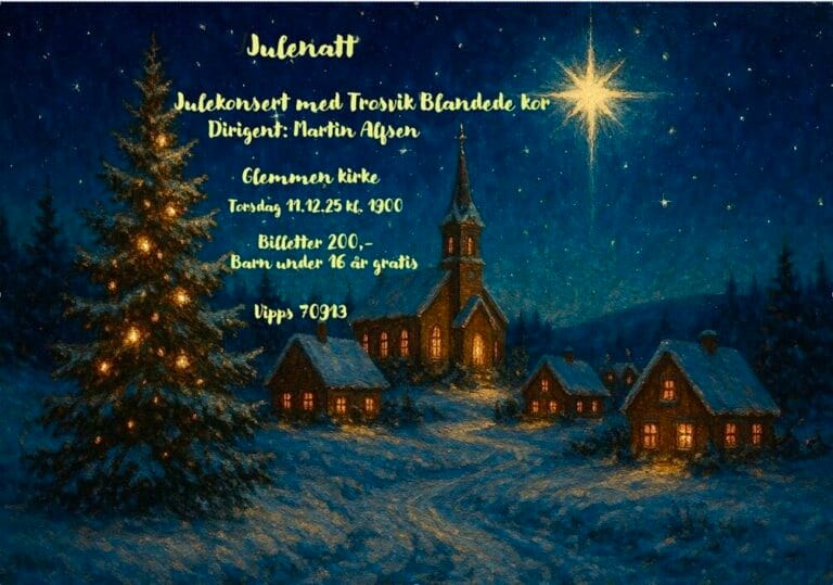 Torsdag 11. desember arrangerer Trosvik blandede kor vår tradisjonelle julekonsert i Glemmen kirke. Det blir et spennende innhold med både klassiske julesanger og noe nytt. Dirigent for kvelden til er Martin Alfsen og det blir flere innslag med ulike solister. Billetten kan enten kjøpes på Vipps, ved å sende 200,- til 70913 eller i døra. Barn og unge under 16 kommer inn gratis. Velkommen!